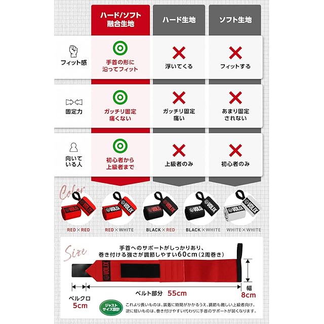 レモンチャンネル推奨 リストラップ【特許出願中2種類の生地が融合してガッチリ固定できるのに、痛くない】筋トレ 手首 サポーター ベンチプレス (レッド×ホワイト)