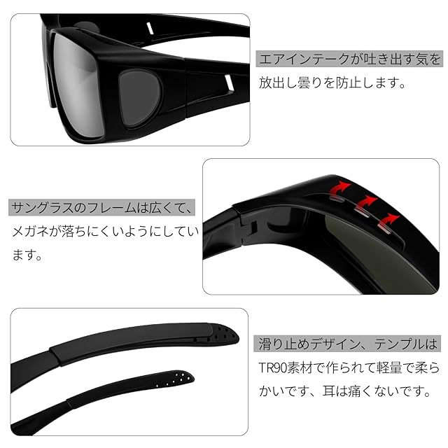 眼鏡着用者の福音書、大きめ対応:オーバーサングラスとはメガネの上に掛けられる機能的なサングラスです。メガネの上からはもちろん 、メガネなしでも直接掛けることができます。いろいろなサイズのメガネに合うために、レズン特大なTAC偏光を採用しました、近視、遠視、老視の眼鏡かけた人もご利用できます。二重メガネを掛けても、違和感がなく、逆に掛ける人がおしゃれなオーラがさしているようなかっこいいサングラスです