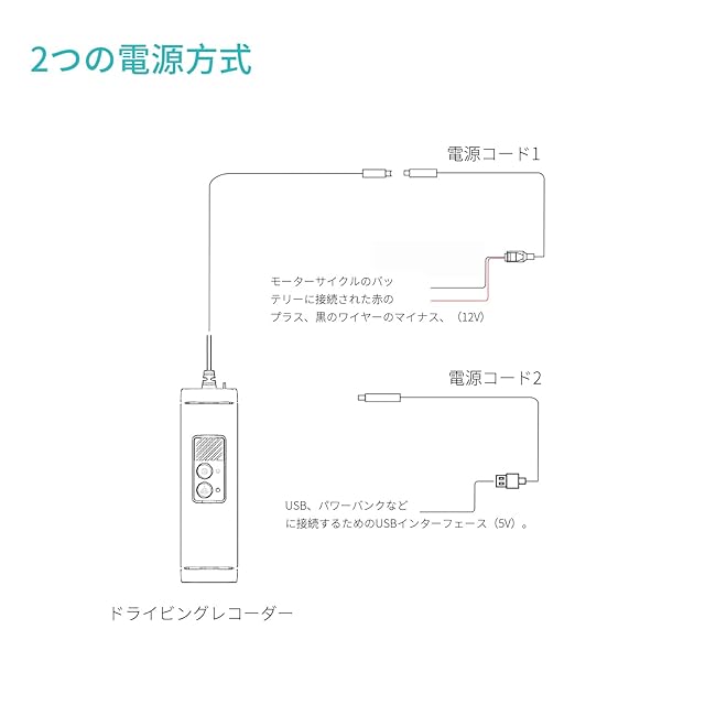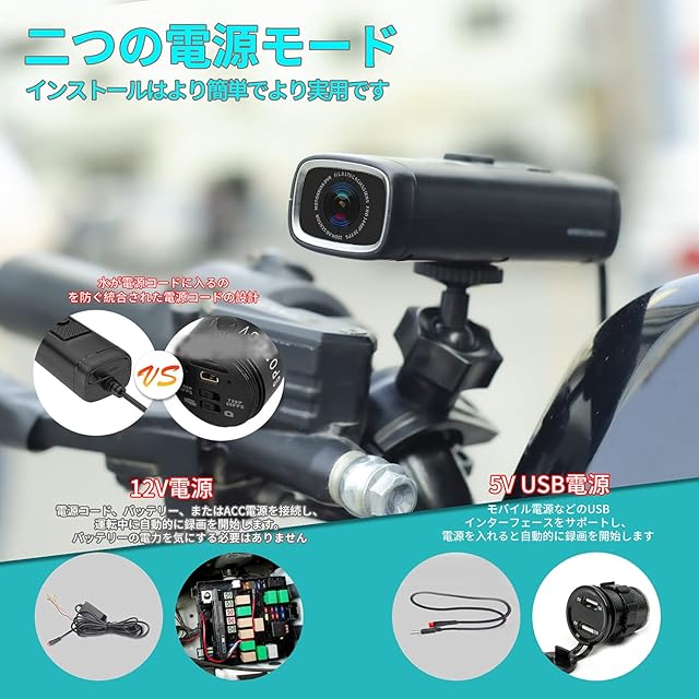 「デュアル電圧対応」本ドラレコ バイクは5V(USB給電)と12V(バイクバッテリー直結)の両方に対応しており、全ての車種に適合。電圧不一致の心配は不要です!高画質センサーで鮮明な録画が可能なドライブレコーダーは、120°広角レンズとナイトビジョン、WDR技術を備えたこのバイク用ドラレコは、暗い場所でも高精細な映像を記録します、暗い場所でも高精細な映像を記録します。