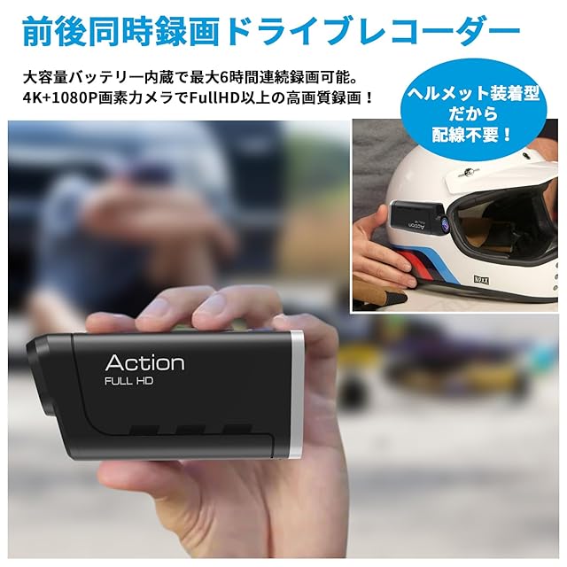 商品名:4K ドライブレコーダー本体 車載 2カメラ 前後同時録画 自動車 装着即時録画 WiFi 3000mAhバッテリー内蔵 スマート感知センサー 前後カメラ アクションカメラ ウェアラブルカメラ バイク用ドライブレコーダー ヘルメット装着 自転車 スマホ連携 小型 バイクドラレコ ループ録画 オートバイ ドラレコ 高防塵防水機能 煽り運転対策 日本語説明書