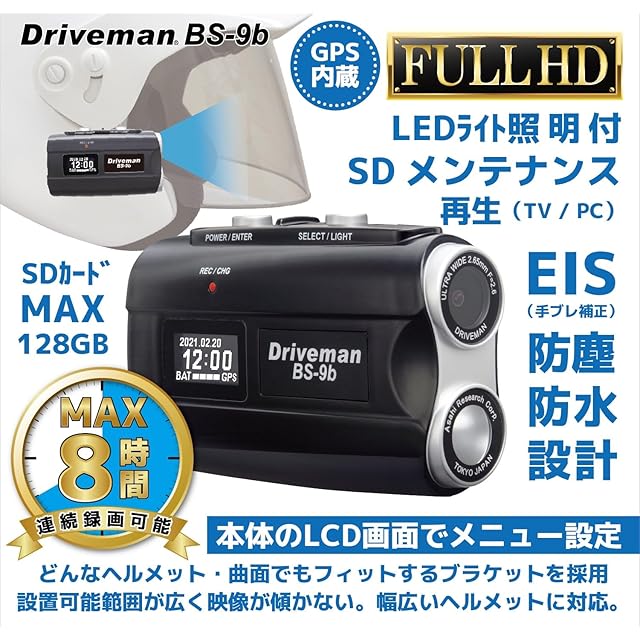 アサヒリサーチ Driveman バイク用ドライブレコーダー 警察採用ブランド BS-9be-32G-W 通販用パッケージ 32GBSD付 防水 IP65 フルHD ヘルメット 自転車