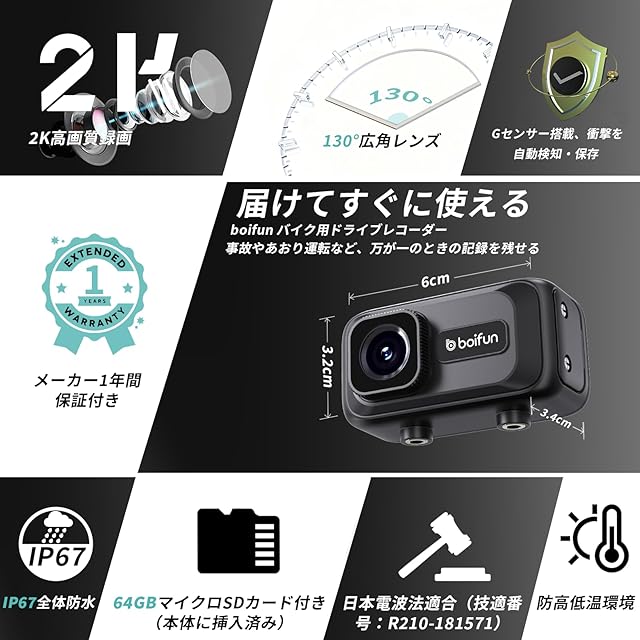 【自転車用とバイクドラレコ】BOIFUN 2K録画(400万画素)IP67全体防水 小型 スマホ連携 microSD 64GB付属 バイク用ドライブレコーダー 130°広角 Gセンサーで緊急録画 自動録画 常時録画 ループ録画 原付・スクーター・自転車対応 アクションカメラ 煽り運転対策 WiFiと専用アプリ 日本語説明書付き メーカー