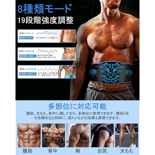 ♥【8モード・19強度・USB充電式】この布製腹筋ベルトが8種類モードや19段階強度があり、リモコンは液晶画面が搭載されて、身体に貼り付ける際に使用しているモードの種類や段階の強さが分かりやすいです。お筋肉の耐久性、脂肪の厚さによって適当の組合パタンを調整し、より快適なトレーニングが楽しめます。初心者にもプロにも、女性にも男性にも、個人の需求も満足できます。