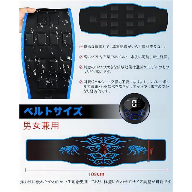 【2025新登場 】EMS 腹筋ベルト ジェルシート不要 8腹筋パッド 14枚伝導布 柔らかい布製 水を吹きかけるだけ 8種類モード 19段階強度 液晶表示 USB充電式 腹筋トレーニング器具 ベルトサイズ調節可能 男女兼用 日本語説明(ブルー)