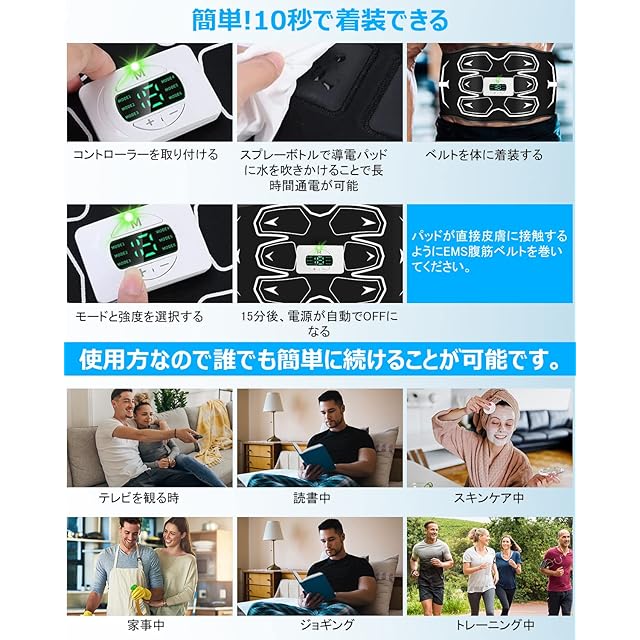 ♥【効果が抜群・品質】運動不足や美しいボディラインを作りたい方々に最適!腹筋ベルト15分のエクササイズはジョギング3500m、腹筋鍛え45分または自由水泳45分に相当します。なかなか落ちないお腹周りの肉を、知らない間に落としてくれる。腰部、大腿、尻にフィットして体多部位に使用できます。梱包詳細:腹筋ベルト*1、コントローラー*1、USBケーブル*1、スプレーボトル*1、日本語取扱説明書*1。商品に問題があった場合は、弊社までご連絡いただき、迅速に対応させていただきます。