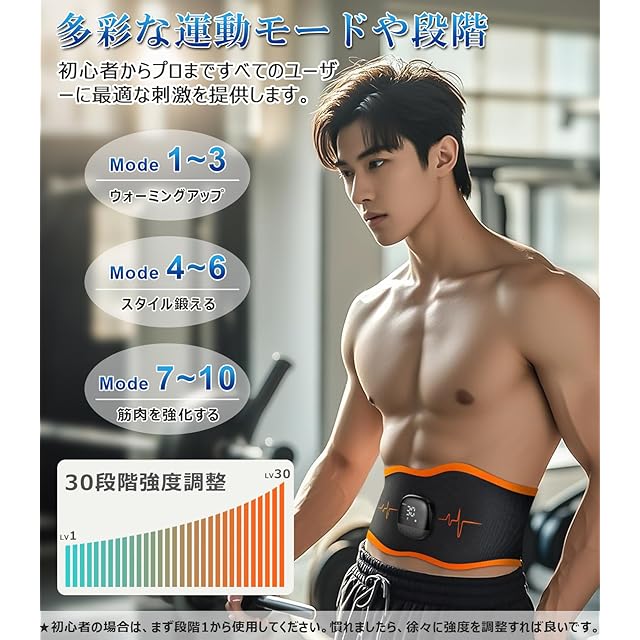 腹筋ベルトは、10種類の異なるモードと30段階の強度調節機能を搭載しております。各モードは、特定の目的に合わせて設計されており、さまざまな効果を得ることができます。