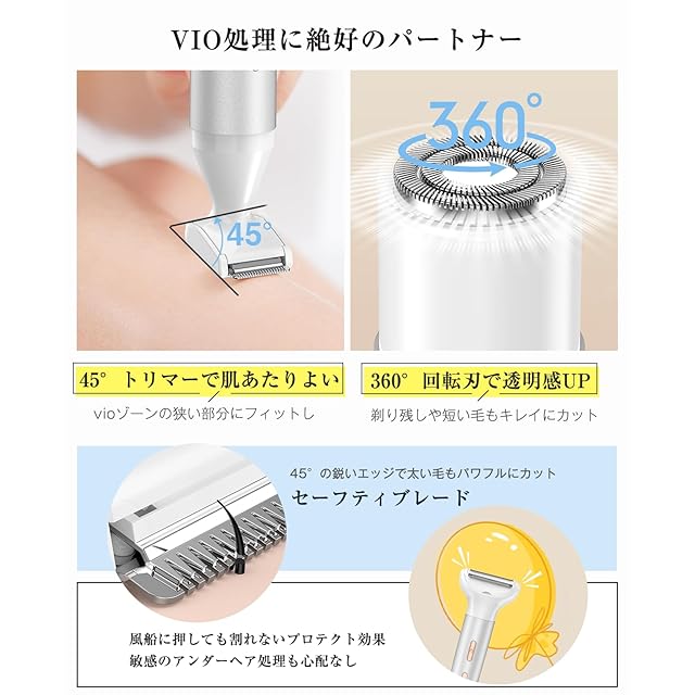 【肌に優しくて徹底的なVIOケア】脱毛サロンのプロの監修でVIO専用シェーバーは肌を傷つけにくい専用R型刃が採用され、少し照れるデリケートゾーンのお手入れもやさしくできます。トリマー刃は45°設計で狭い部分のムダ毛への処理も簡単で、肌の凹凸に合わせてやさしくシェービングします。そして付属するガードでムダ毛の量や長さが調整できます。360°回転式の刃が内蔵され、肌に直接に触れないので、ケアするときの痛みがなし、剃り残しをパワフルカットでき、細かく仕上げます。自宅で憧れのVIOラインを実現し、女性魅力が現れます!