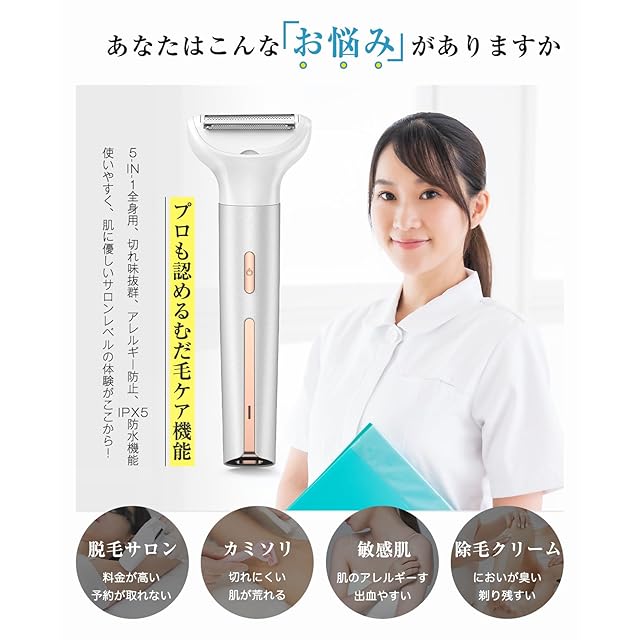 【全身用5in1多機能シェーバー】全身適用のレディースシェーバーはボディシェーバー、トリマー刃、眉毛シェーバー、鼻毛カッター、回転刃の5種類交換ヘッドが付属し、1台だけで5役の機能を備えます。眉、小鼻や細かい部分からvioゾーンまで徹底的に!ビキニライン、デリケートゾーン、顔、脇、足、腕などの全身のムダ毛処理が簡単になります。脱毛サロンは料金が高い、カミソリは毛が生えやすい、クリームはアレルギーの可能性が高い、これ1本でこんな悩みから解放!全身に使えるセットでお得感満載!
