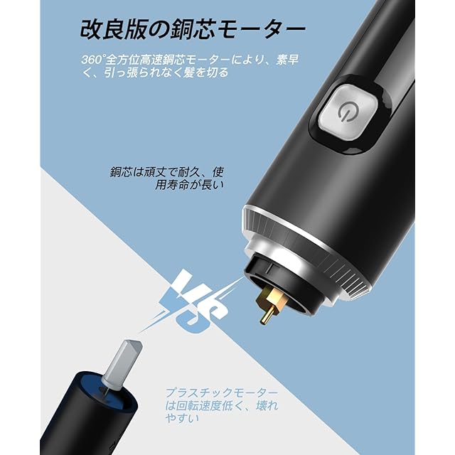 【静粛・高性能両立、ノイズフリーなトリミング】当製品は全銅 DC の高トルクブラシレスマイクロモーターを搭載し、カーボンブラシの摩擦音を低減し、スムーズかつ安定した動作を実現します。1 分間 13,000 回転で強力な動力を発揮し、360 度双方向回転の精密ダブルエッジステンレスブレードと組み合わせ、硬い鼻毛や耳毛も簡単に処理できます。カッターヘッドは人間工学に基づく 3D デザインで、保護キャップ付き。丸形刃が鼻毛を正確に捕らえ、鼻腔に密着して、鼻毛を引っ張らず、内部を傷つけることなく安全にトリミングできます。アレルギーにも強く、快適に使用できます。コンパクトな本体で、強力なトリミング能力を備えながら、回転音を最小限に抑え、静かな環境でも他人に迷惑をかけません。