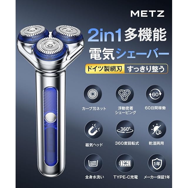 【1台多役】メッツ シェーバー ひげそり 電動シェーバー メンズ 電動髭剃り 電気カミソリ メンズシェーバー 360°回転式 乾湿両用 3刀頭 54枚刃 二重剃刀ネット 深剃り 鼻毛カッター付き USB type-c 充電式 IPX7防水 乾湿両用 低騒音 持ち運び 収納ケース付き 出張 旅行 男性用 誕生日 プレゼント (Silverシルバー, 3つヘッド)