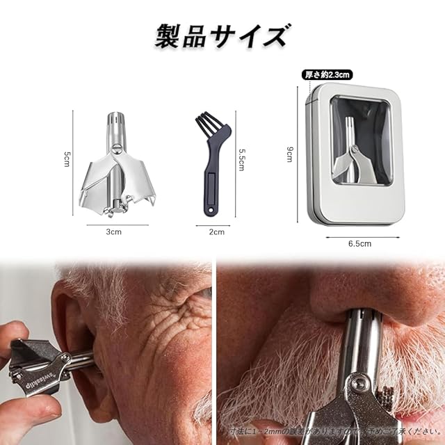 【製品詳細】鼻毛修理器×1、クリーニングブラシ×1、収納ケース×1、製品包装サイズ約3*6*9 cm、重量約60 g、軽くてコンパクト、デート、散歩、旅行や出張先などの持ち運びにも便利。手動式でバッテリ不要で、いつでもどこでも使用できます。