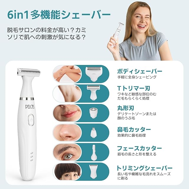 PELCAS 1台6役除毛器 VIO専用シェーバー 防水 ドライ剃り レディースシェーバー vio電気 女性 2025新型 鼻毛カッター 眉毛 多機能 ムダ毛処理 顔 脇 腕 すね毛 ビキニライン 水洗い可能 USB充電式 日本語説明書付き