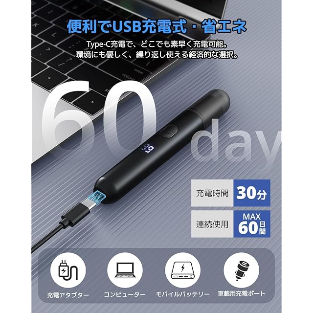 【USB充電式・1時間充電で最大60日使用】 USB充電式のため、パソコンやモバイルバッテリーから手軽に充電でき、わずか1時間でフル充電が完了。最大60日間使用できるロングバッテリーを搭載しており、毎日のお手入れはもちろん、旅行や出張でも充電の心配がありません。忙しい朝でもサッと使え、外出中でも身だしなみを整えられる頼もしい1台です。(※5V/1A充電器の使用を推奨)急速充電器の使用による故障リスクを避け、長く安心して使うためにも推奨環境での充電が最適です。電池切れを気にせず、いつでもどこでも完璧な眉ケアを維持できます。