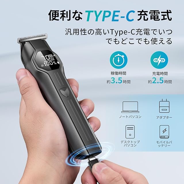 ▶急速Type-C充電・LEDデイスプレイ◀使いやすいType-C充電で、1500mAh大容量リチウムイオン電池を搭載し、2.5時間の充電で、3.5時間の連続使用が可能です。このバリカンはLEDディスプレイでバッテリー残量が使用する時も充電する時もデジタル表示で一目瞭然です。洗浄喚起機能も付いておりますので、本体が過負荷になると、洗浄喚起ランプが点灯します。定期的に洗浄して、シェービングヘッドに堆積した毛クズや皮脂汚れを最小限に抑えることができます。また、安全ロック搭載で、安全ロックをオンにする時、電源ボタンを3秒間長押ししないと動かないため、小さなお子様がいるご家庭でも安心してご使用頂けます。