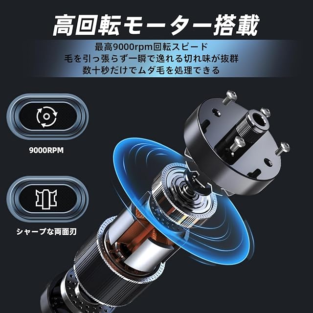 【肌に優しくて・鼻毛をお手入れ】 9000RPMのエチケットカッター 高速モーター駆動を搭載しております。電池残量が少なくなっても、パワーレベルを着実に下げることができるので、毛を引っ張ることによる痛みやケガを防ぐことができます。