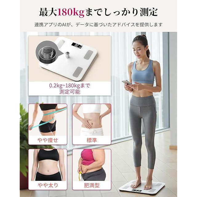 【高精度体組成計で健康管理をスマートに】180kgまで対応の高耐久設計で、あらゆる体型を正確に計測。Bluetooth接続によりスマホと連動し、体重・体脂肪率など16項目の体組成データを自動記録。毎日の変化をグラフ化して健康トレンドを把握できるため、ダイエットやトレーニングの効果測定に最適。薄型デザインで収納場所を選ばず、浴室近くの狭いスペースにもすっきり配置可能。