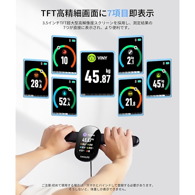 【体組成計に7つ結果即確認】本体重計は最先端の3.5インチTFT超大型高解像度スクリーンを採用し、測定結果の7つが直接に表示され、スマホ開けなくても、重要指標を直接に確認できます(ご注意:初めて使う場合、スマホとバインドして登録する必要があります。そうしないと、体重しか表示されません)。この体脂肪計のスクリーンがハンドルがに接続されているため、見やすいです。