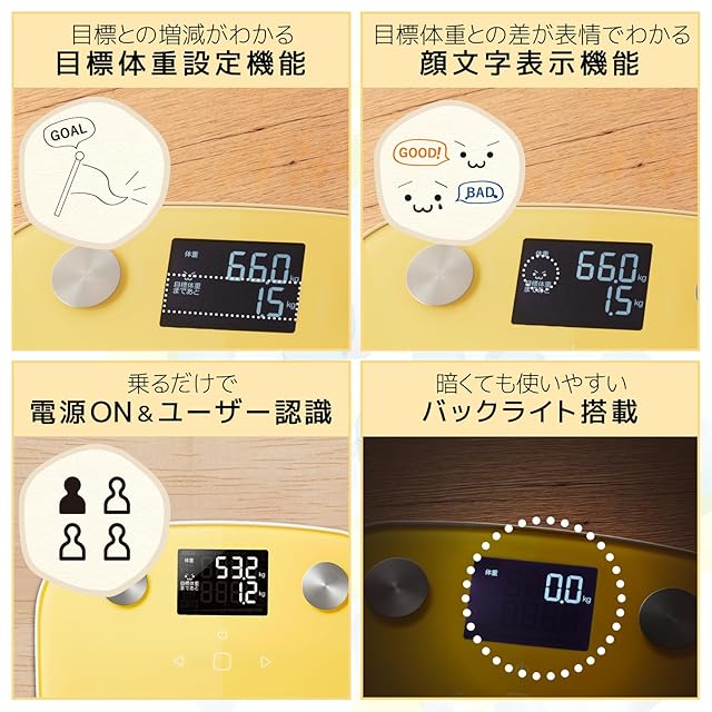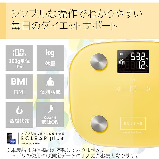 エレコム(ELECOM) 体重計 体組成計 バックライト付き 【 体重 BMI 体脂肪率 基礎代謝 目標体重設定機能付き 】 100g単位測定 エクリア イエロー HCS-FS03YL