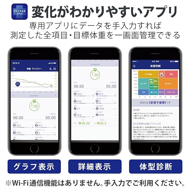 体重・前回差・内臓脂肪レベル・BMI・体脂肪率・骨格筋率・骨量・基礎代謝の8項目が測定可能です。