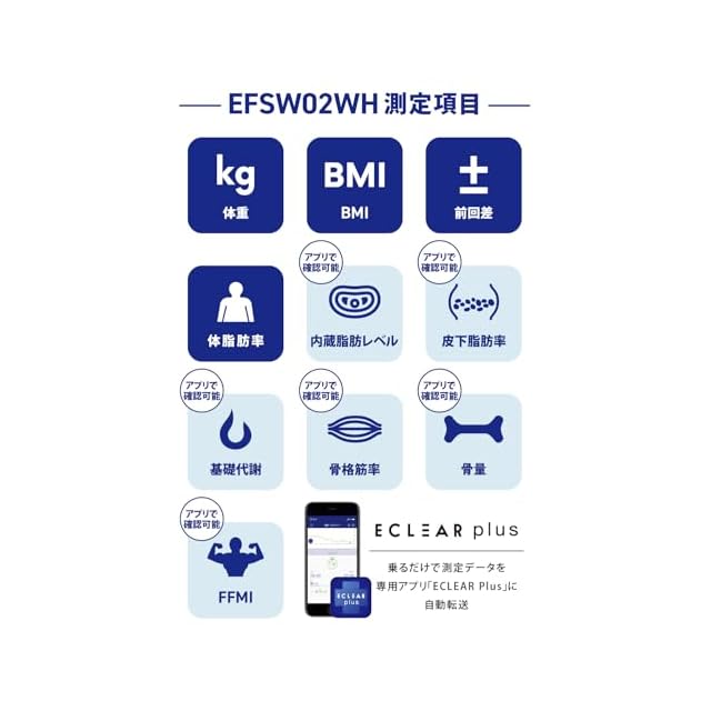 製品本体で3項目(体重・BMI・前回差)と、専用アプリ「ECLEAR plus」で7項目(体脂肪率・内臓脂肪レベル・基礎代謝・骨格筋率・骨量・皮下脂肪率・FFMI)を確認することができます。