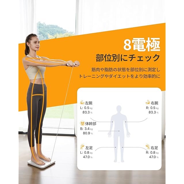 【8電極・部位別測定】体組成計と体重計を掛け合わせた 8電極の体重体組成計!部位別(左腕・右腕・左脚・右脚・体幹部)ごとの脂肪・筋肉などの状態をそれぞれに測定し、トレーニングやダイエットをより効率的。さらに、2つの周波数(デュアル周波数)で体組成を測定することで、高精度で体組成測定が可能になりました。測定範囲:3kg-152.3kgまで測定可能。