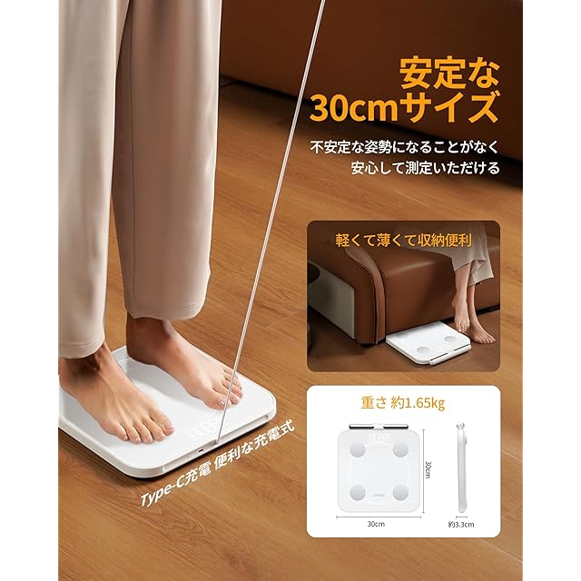 【操作簡単・usb充電式】体組成計に乗るだけで自動的に電源をオンになり、測定後体重計から降りると自動でオフになる体脂肪計です。測定時間が約15秒なので、忙しい朝でもストレスなく測定できます。Type-C充電タイプなので、繰り返し充電できて、乾電池を頻繁に買う必要がなくて、ランニングコストがかからなくて、もっと経済的、エコです。 【サイズ】約30×30×3.3cm 【重さ】約1.65kg