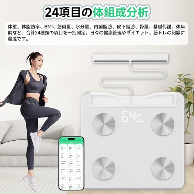 商品名:体重計 体重計 スマホ連動 体組成計 体脂肪計 ヘルスメーター weight scale 体重秤 8電極 体脂肪率/BMI/骨格筋率/基礎代謝量/水分量/体年齢/内臓脂肪レベル 日本語取扱説明書 日本語App 電池付属 ホワイト