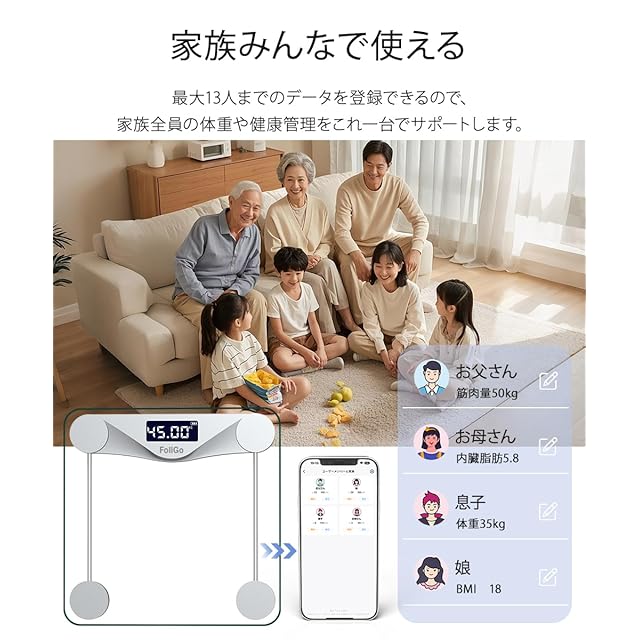 【家族全員で使えるマルチユーザー体重計】本体重計は最大13人分のユーザー登録に対応。乗るだけで体重の傾向を自動判別し、記録の取り違えを防止します。家族一人ひとりの体組成データを個別に保存できるため、家庭全員の健康状態をまとめて管理できるファミリー対応の高機能体重計です。