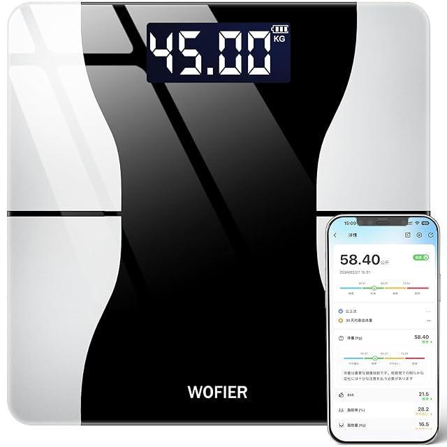 商品名:【2025アップグレード版・業界最薄級】 体重計 体脂肪計 体組成計 スマホ連動 Bluetooth 高精度 ヘルスメーター iOS/Android対応 強化ガラス 自動ON/OFF 多機能測定 13項目 日本語説明書付 ダイエット 健康管理 筋肉量 水分量 BMI対応 コンパクト 携帯便利 自宅/会社 男女兼用 (オフブラック)